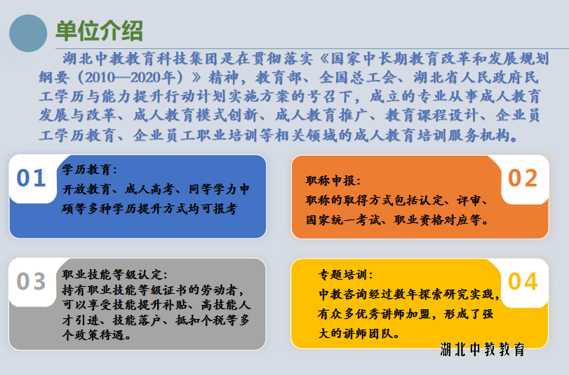 湖北中教教育集团是在湖北省人民政府提出建设人才强省,确立“人力资源开发首位地位”的重要思想指导下,在湖北人力资源和社会保障厅、湖北省教育厅等单位支持下成立的教育培训和人力资源开发综合服务平台。目前业务涉及教育培训、教育课程设计、学历教育、职业培训、专业技术人才评审、教育软件开发、党政干部培训、人力资源服务、新媒体技术研究等多个领域。