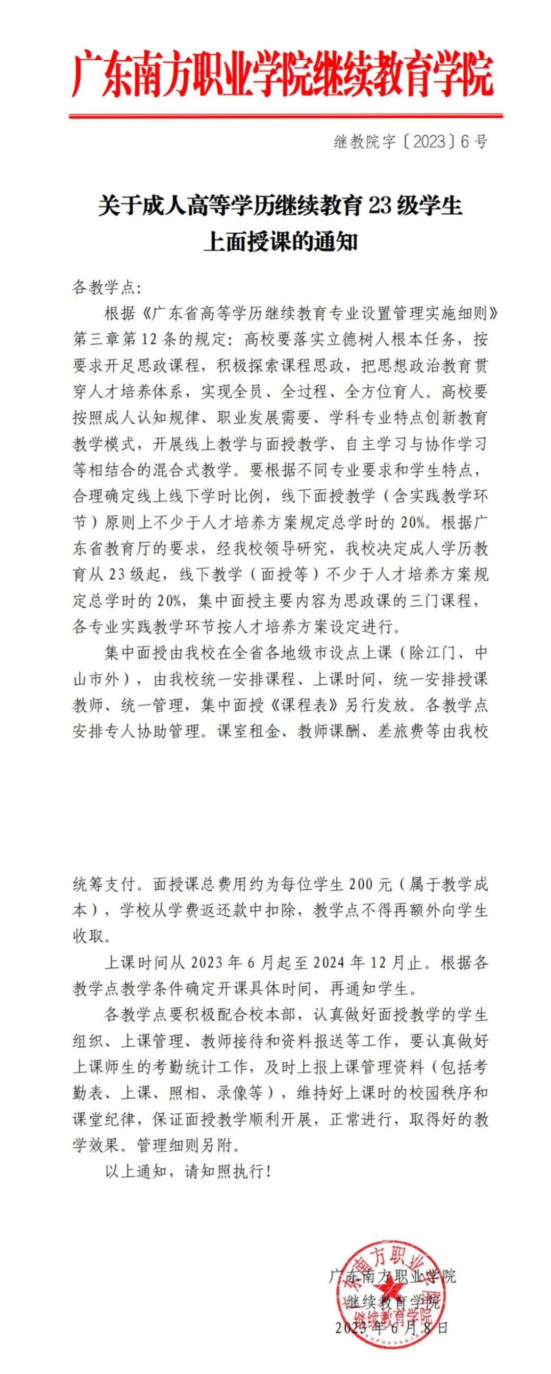 广东南方职业学院(以下简称“南职院”)率先发布《关于成人高等学历继续教育23级学生上面授课的通知》,通知表明:南职院成人学历教育从23级起,线下教学(面授等)不少于人才培养方案规定总学时的20%,而且增加面授课程费用,面授总费用为200元每生,这意味着未来,不仅需要线下上课,还要额外支付面授费用!